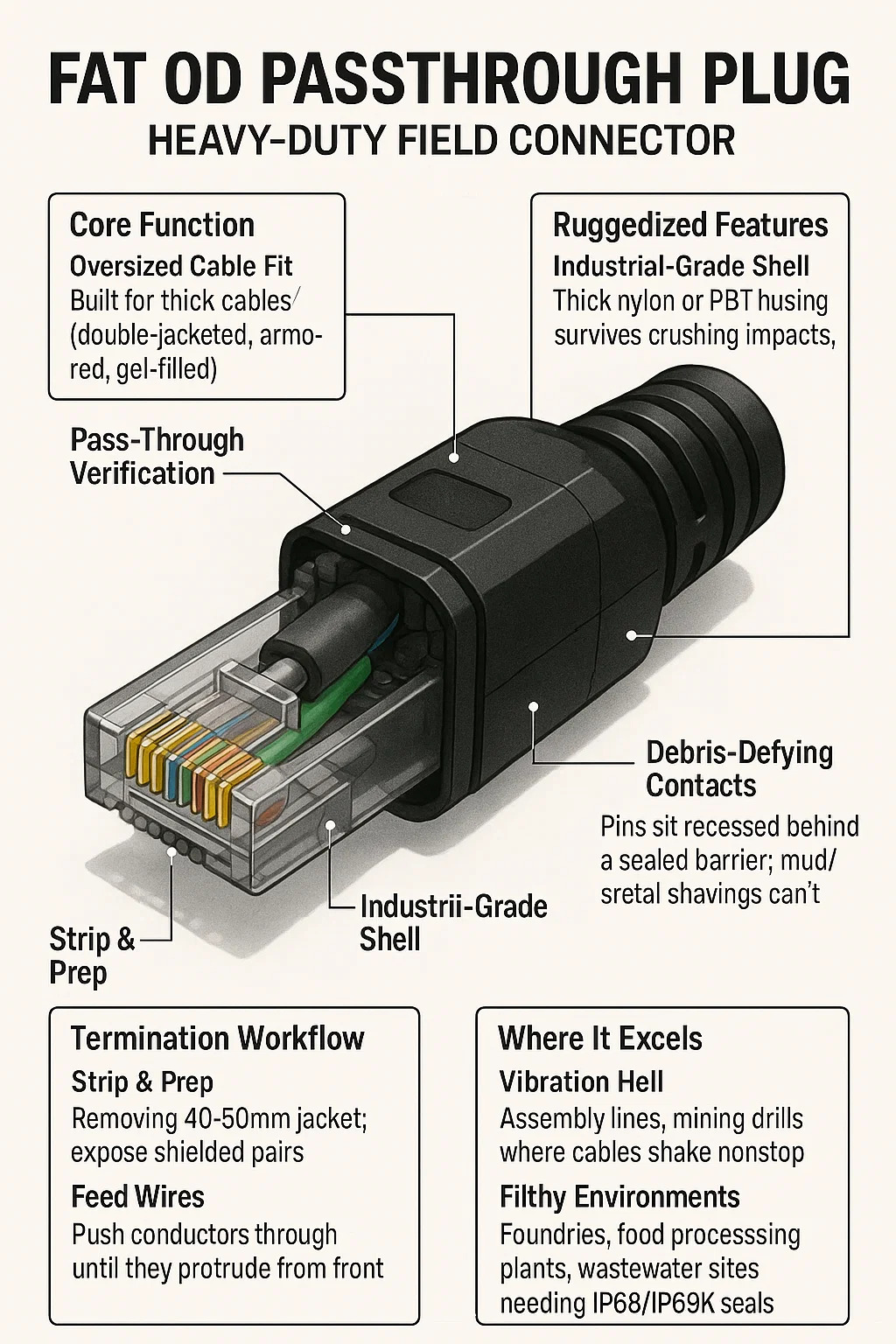 Nadměrné kabelové uložení: Postaveno pro silné kabely (dvojitě Jacket, obrněné, gelové naplněné), které se nehodí standardní zástrčky.