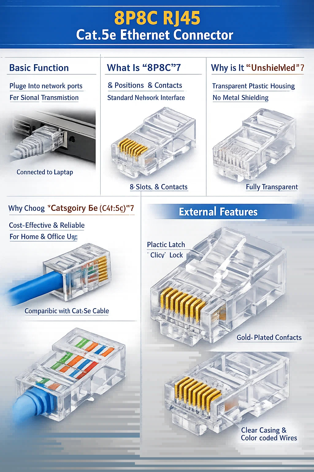 Toto nestíněná modulární zástrčka 8P8C Cat.5e je ve skutečnosti nejběžnějším typem "konektoru RJ45", který se nachází v mnoha domácích širokopásmových sítích, a to jak v minulosti, tak v současnosti. Je transparentní, kompaktní a základní komponenta pro připojení k síti.